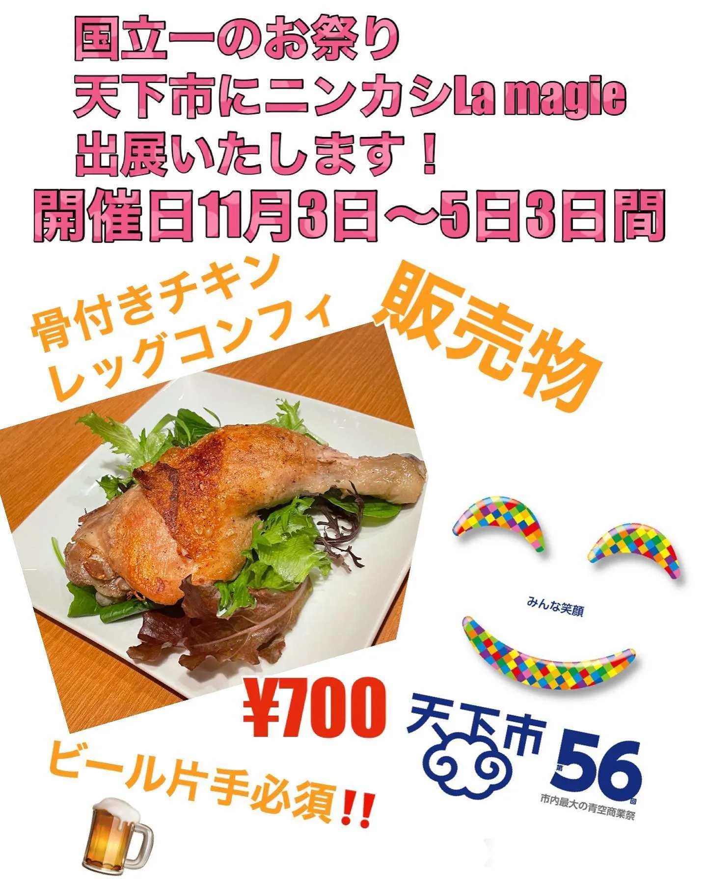 2023/11/01 天下市のお知らせ!! 2023/11/01天下市のお知らせ!!こんにちは😃11月3.4.5日の国立市まつりの天下市に3日間出店いたします!骨付きチキンレッグコンフィを販売します!¥700是非皆様遊びに来てくださいね!ビール片手に来るの…