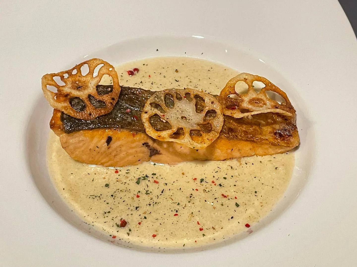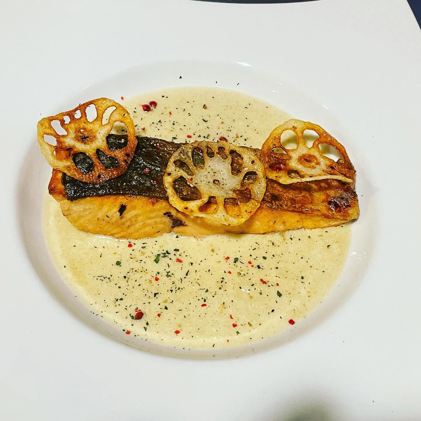 2023/09/22北海道産秋鮭ムニエルこんにちは😃今週から始まった北海道産秋鮭のムニエルとレンコンと牛蒡のクリームソースがとても評判良く美味しいと言っていただいてます!とても立派な秋鮭は皮目パリッと…