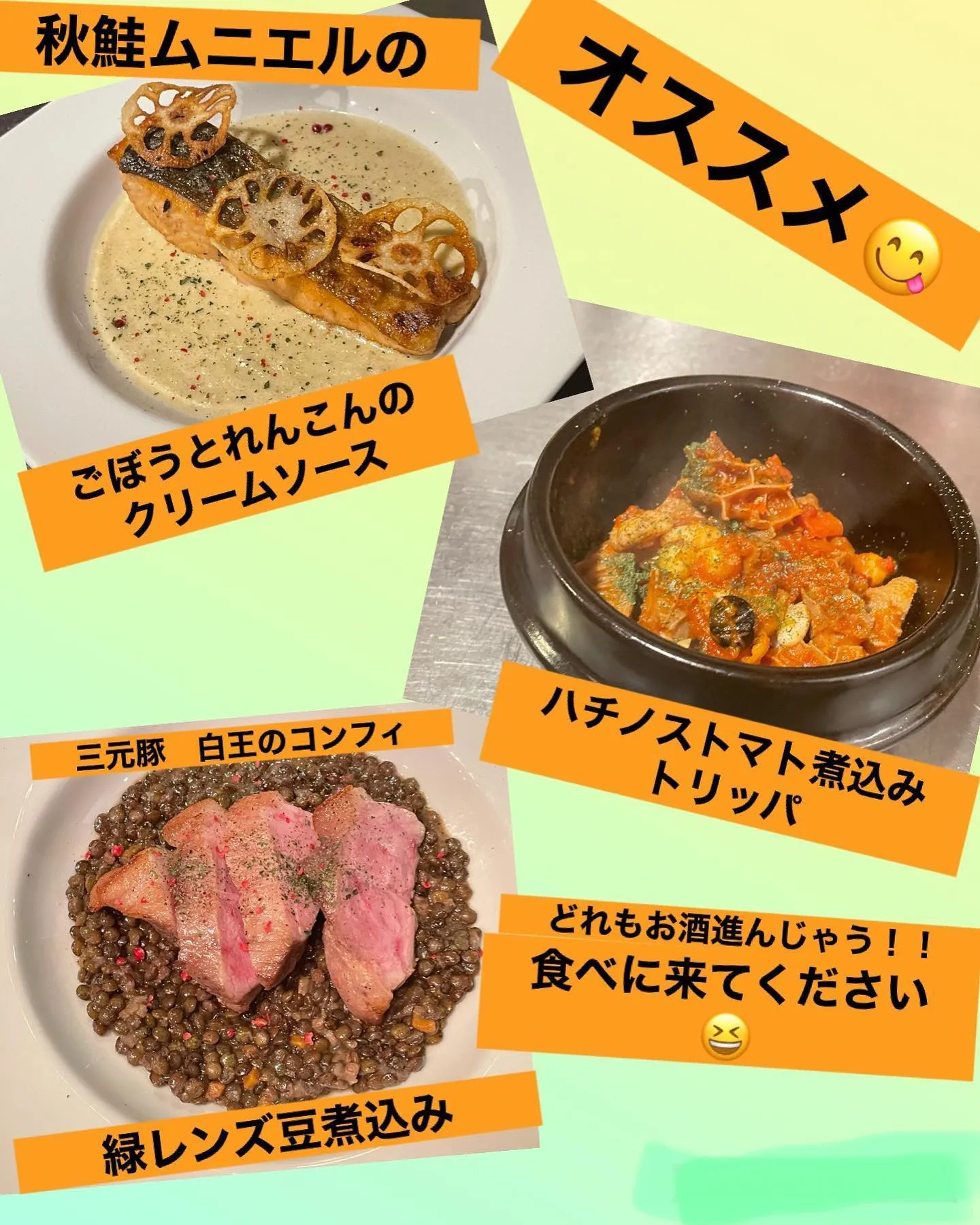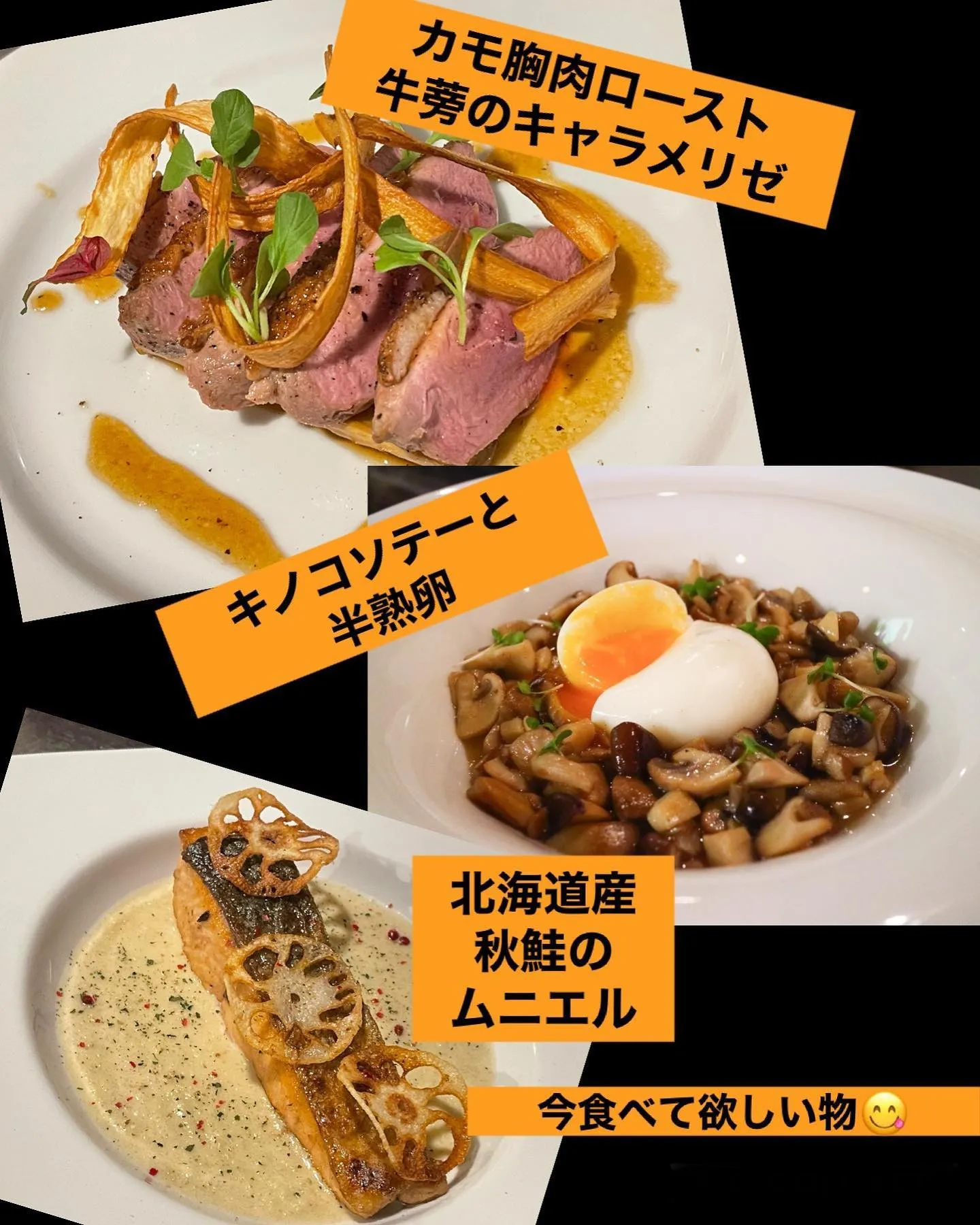 2023/09/12秋の食材こんにちは😃今日から秋の食材を取り入れた料理などを入れてグランドメニューやオススメ料理を変更しました😙写真の2枚一つ目は本日オススメお肉料理を三元豚白王肩ロースのコンフィに緑…