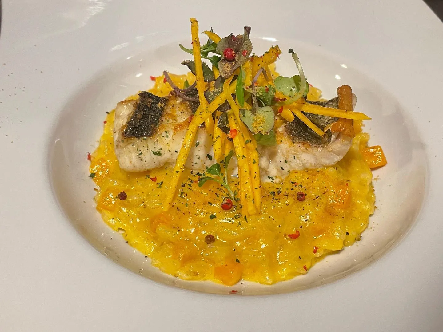 2023/08/06スズキのポワレカボチャのリゾット🎃こんにちは😃空を見ると綺麗な入道雲ですね🤩夏を感じますねー☀️今日は本日の鮮魚料理のスズキのポワレとカボチャのリゾットです!コリンキーカボチャと普通の…