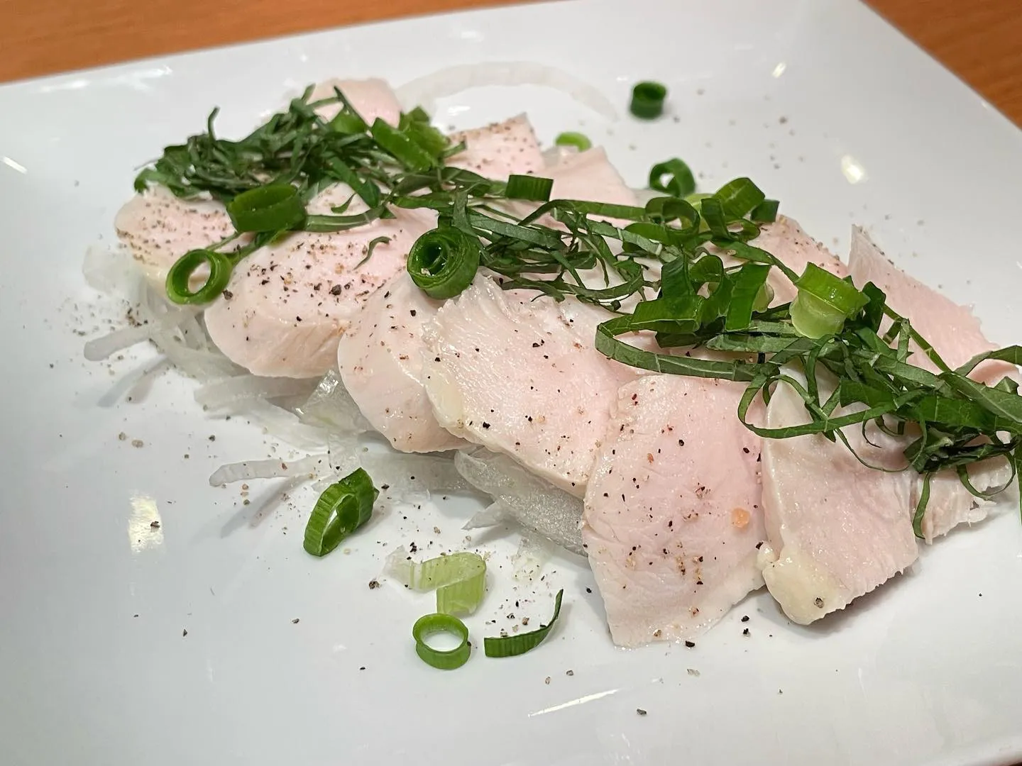 2023/08/10梅酢の鶏むねコンフィ🐓こんにちは😃夏にピッタリなメニューにサッパリとした鶏むね肉料理!!梅酢に付けながら低温調理をしたフレンチの技法を使った和テイストで鶏の上には大葉が乗っています…
