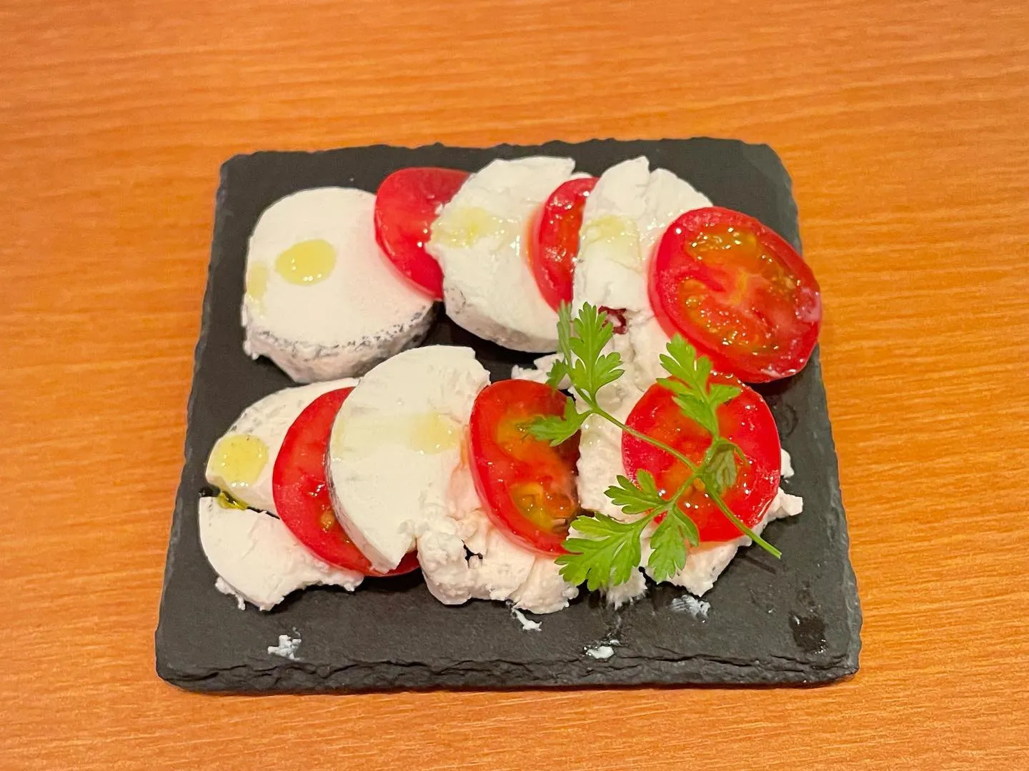 2023/07/27山羊チーズを使ったカプレーゼ🧀こんにちは😃炭を纏った山羊のチーズのカプレーゼが本日料理に!!モッツァレラを使う料理ですが、この山羊のチーズがトマトとまたよく合ってトリュフオイルの香…