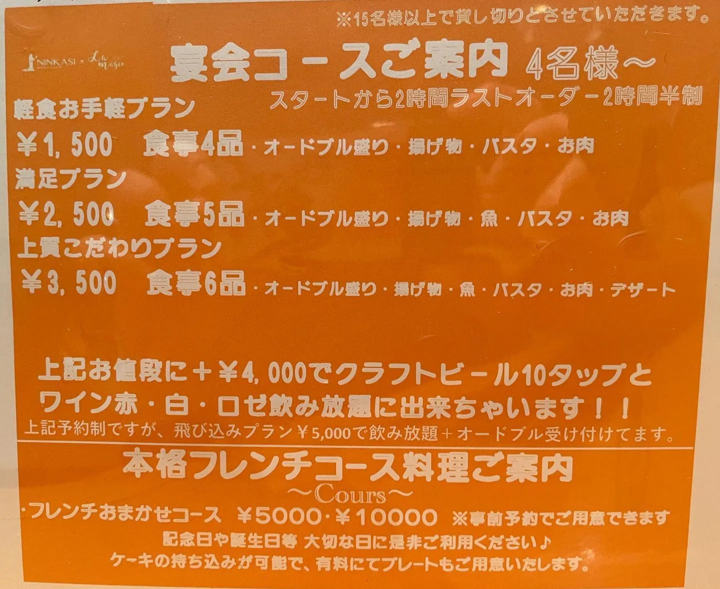 2023/07/29宴会コース・本格フレンチコースご案内😚こんにちは😆ニンカシLamagieで宴会コース始めました〜🍺🍺クラフトビールとワインの飲み放題と各金額コースをお選びいただいて予約制で受け付けております…