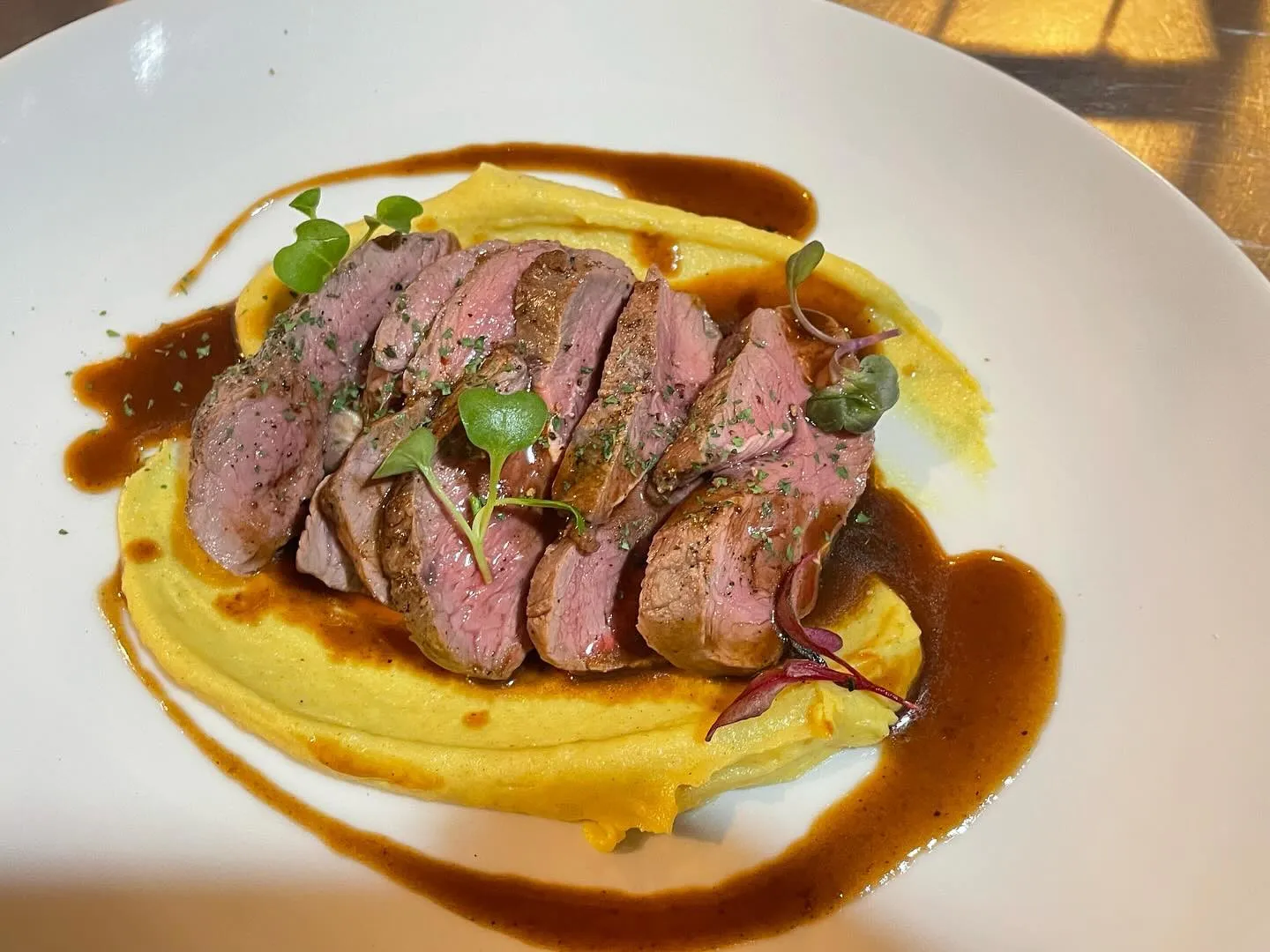 2024/03/15大好評!!ラムロースト出汁のソースこんにちは😃今グランドメニューに出しているラムモモ肉のローストがとても大人気で、とても柔らかくラムの臭みがソースとマッチして食べやすく美味しいと評…