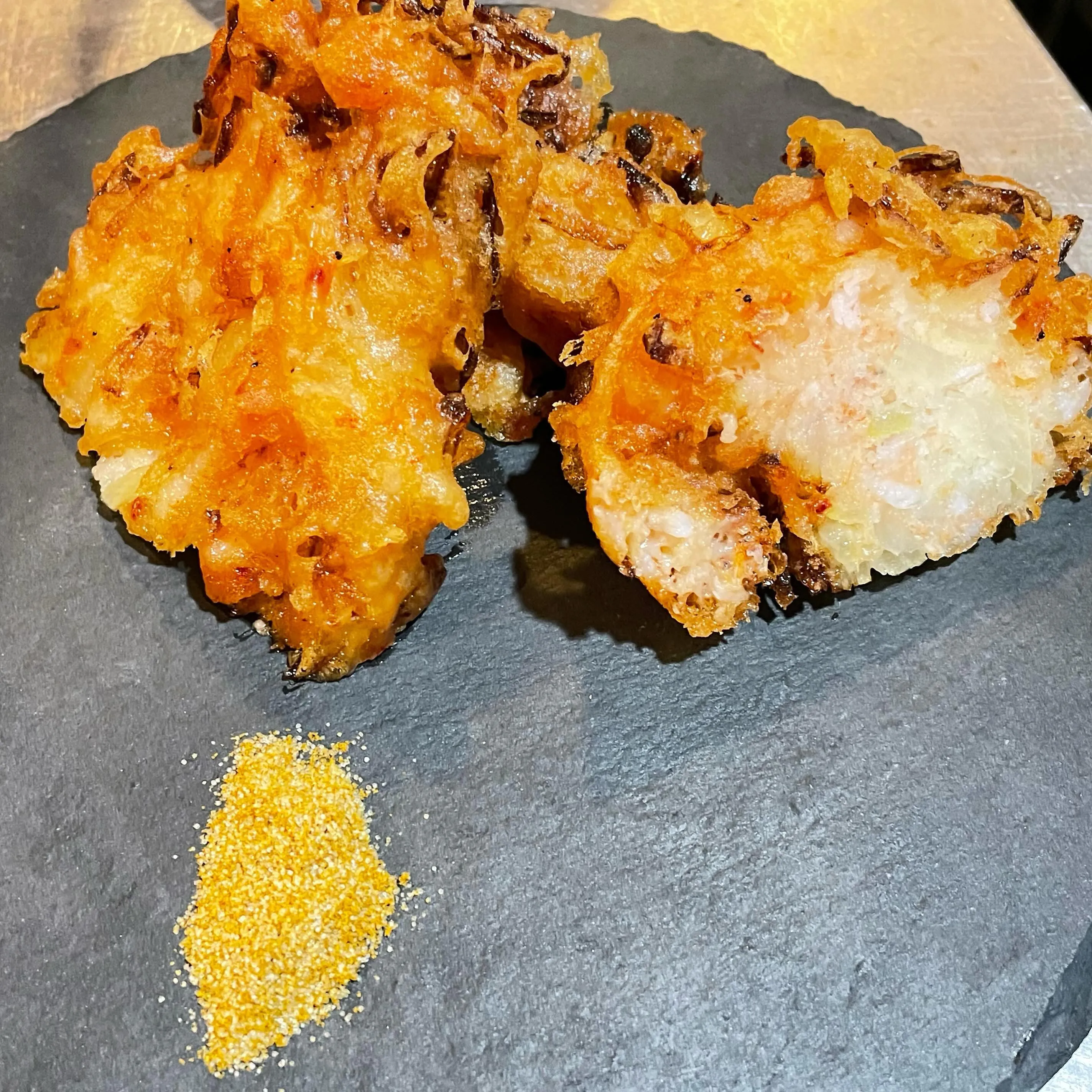 2024/03/23サクラエビと玉ねぎのベニエこんにちは😃今日は、サクラエビと玉ねぎのベニエを紹介!サクラエビと玉ねぎをベニエ生地でかき揚げのようにした一品です。カレー塩を付けて食べるスタイルです!ビ…