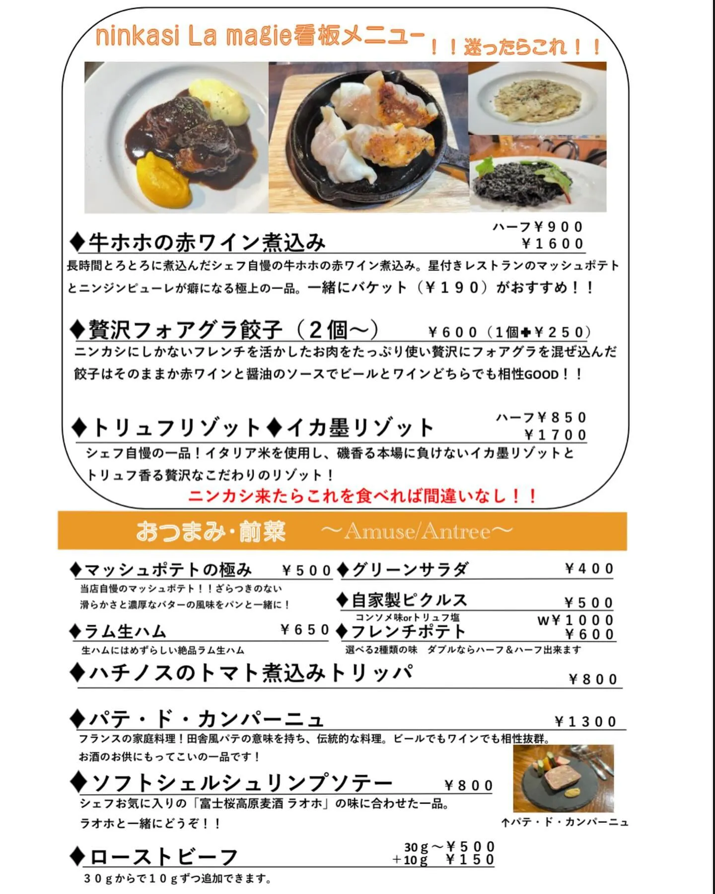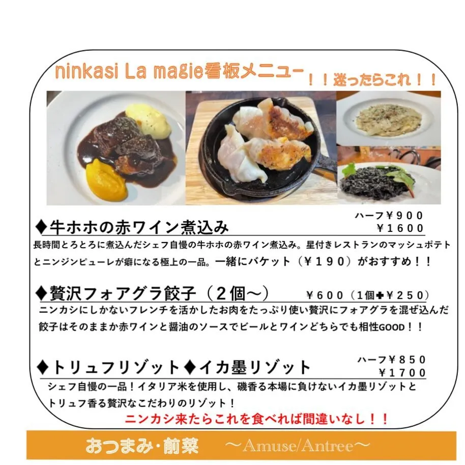 2024/03/06看板メニューを是非一度!!こんにちは😃ニンカシLamagieに来たらこの3品を一度は食べてみてください!!他にも色々ありますが迷ったらまずこれ!是非当店にいらしてください。本日も営業してい…