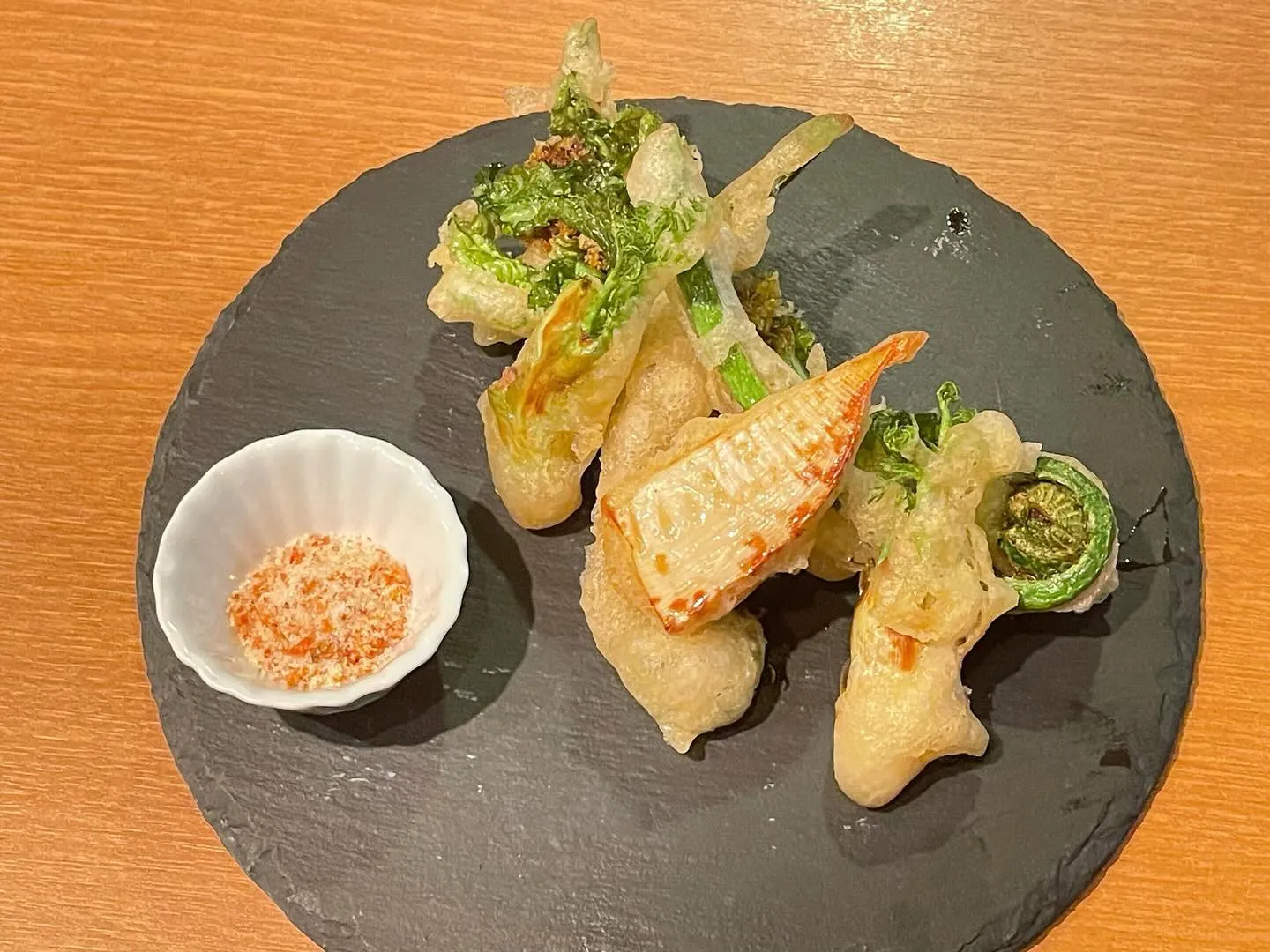 2024/03/14筍と山菜のベニエ復活!!こんにちは😃筍を再入荷したので山菜と一緒にベニエにします!!前回はエビ塩を付けて食べましたが今回はバジルクリームソースを付けて召し上がれ!!是非食べにいらし…