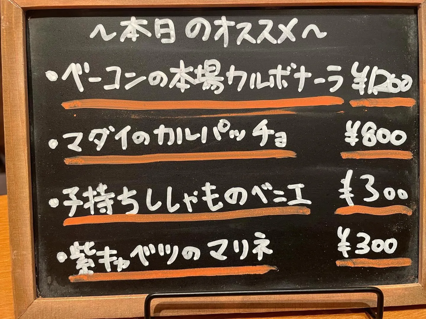 2024/03/13本日のオススメ!!こんにちは😃今日の本日のオススメです!!カルボナーラはまだ食材が残っているので金曜日の達也に続いてやっちゃいます😁ベーコンの香ばしさと玉ねぎの甘みがクセになるお酒…