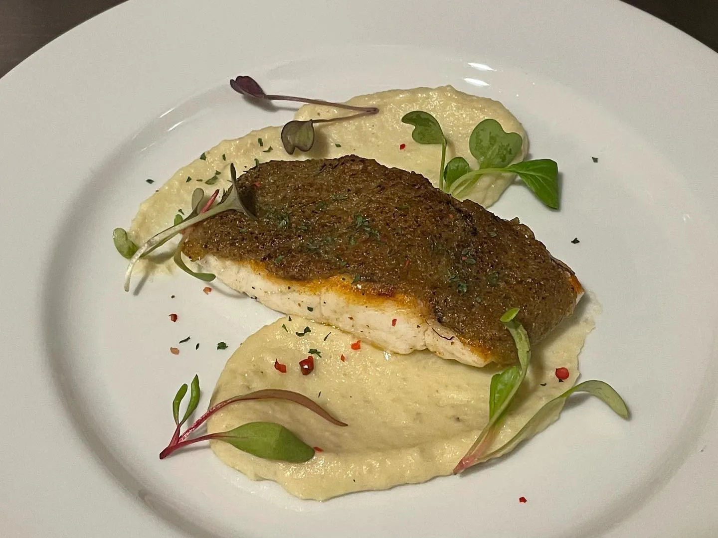 2023/11/10 真鯛のポワレ 蟹味噌のグラチネ 2023/11/10真鯛のポワレ蟹味噌のグラチネ今日は昨日載せた鮮魚料理の写真!下にはゴボウのピューレを混ぜたマッシュポテトに真鯛の上には蟹味噌とパン粉を混ぜた物を乗せてオーブンで焼いて(グラチネ)…