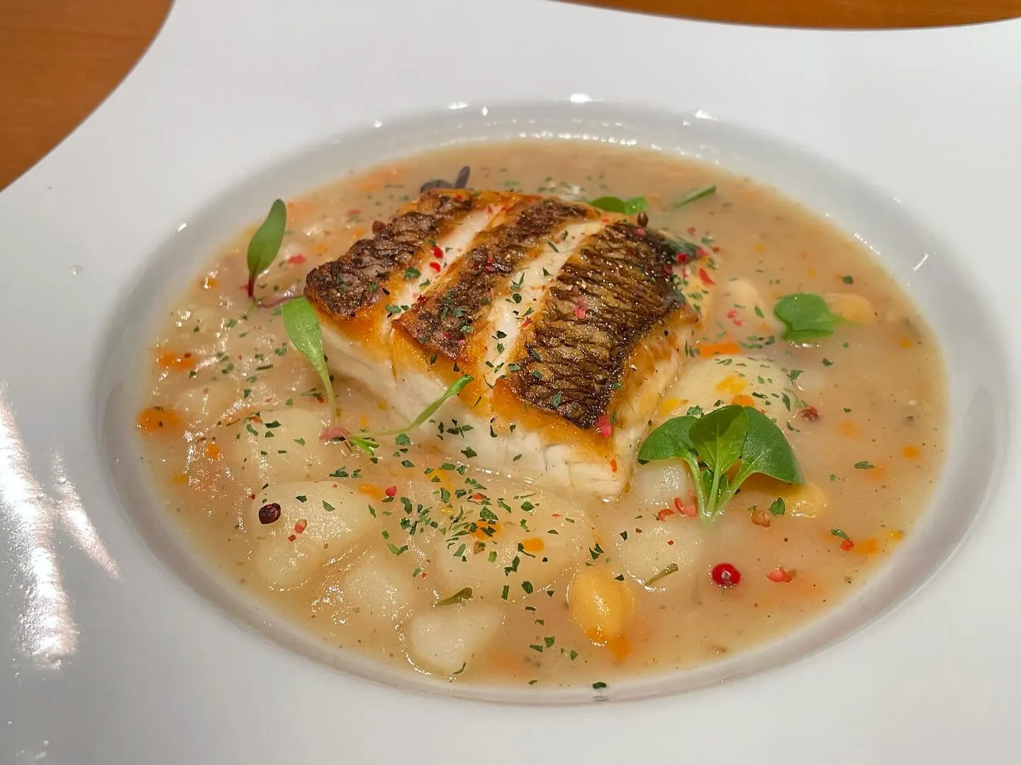 2023/11/17 真鯛のポワレ ジャガイモのスープ仕立て... 2023/11/17真鯛のポワレジャガイモのスープ仕立て!こんにちは😃本日オススメ鮮魚料理載せました♪体が温まるスープ仕立てで、フレンチの田舎風スープ(ガルビュール)をイメージした一品で、とても美味し…